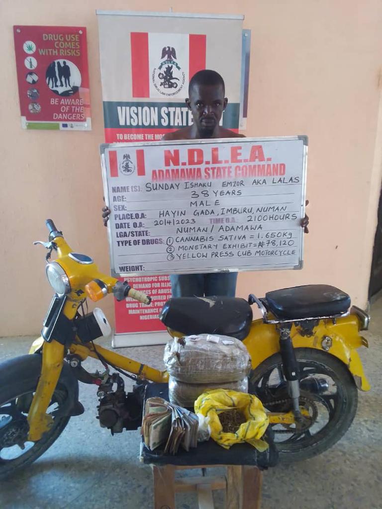 In Adamawa state, a notorious drug dealer, Sunday Ishaku Emzor (aka Lalas) who was convicted and sentenced to 15 years imprisonment in 2010 for drug offences, was on Thursday 20th April arrested for drug dealing. He was arrested at Hayin Gada, Imburu Numan LGA where he went to supply 1.650kg cannabis to an undercover operative. His Yellow Press Cub motorcycle used for supplying illicit drugs and a cash of N78,120 suspected to be proceed of the illegal business were recovered from him at the point of arrest.