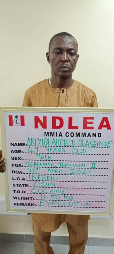 Ariyibi was intercepted on Thursday 20th April at the screening point of MMIA Terminal 2 during outward clearance of Qatar Airways passengers travelling from Lagos via Doha to Medina, Saudi Arabia. When his carry-on bag was checked, four sets of white lace material with linings of substance that tested positive to Cocaine weighing 11.50kg were discovered.