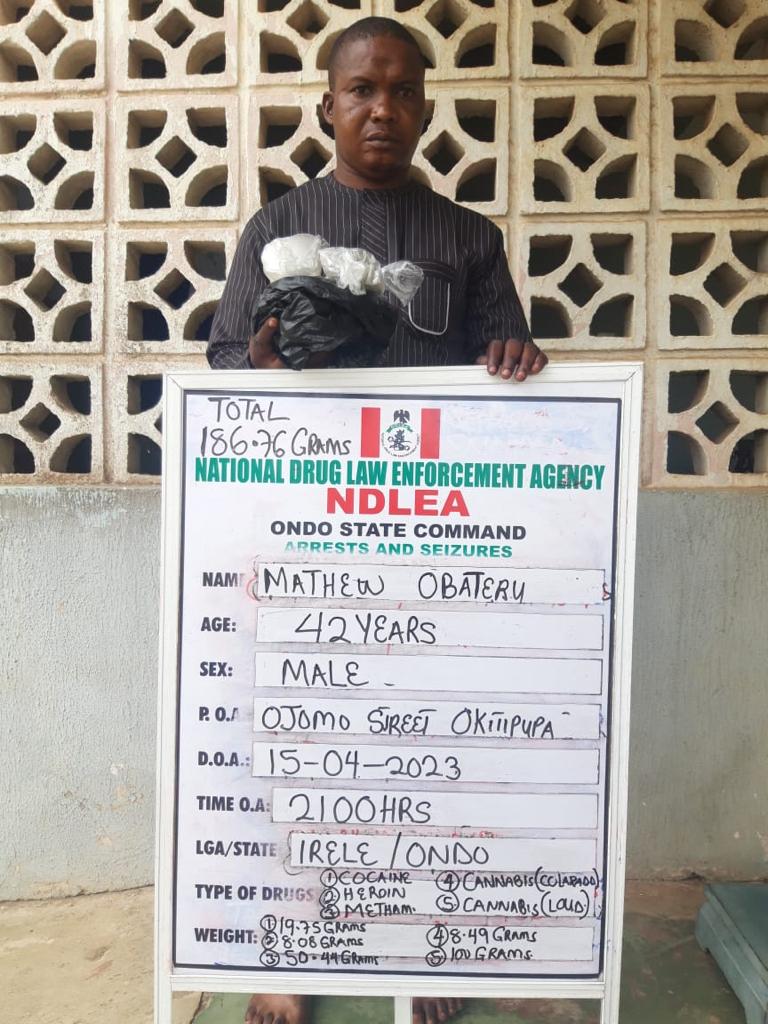 A notorious drug dealer in Okitipupa area of Ondo state, Mathew Obateru, 42, has also been taken into custody after different quantities of Cocaine, Heroin, Methamphetamine, Colorado and Loud were recovered from him. In Taraba, a suspect, Mohammed Usman was arrested on Monday 17th April in connection with the seizure of 10,009 pills of tramadol.