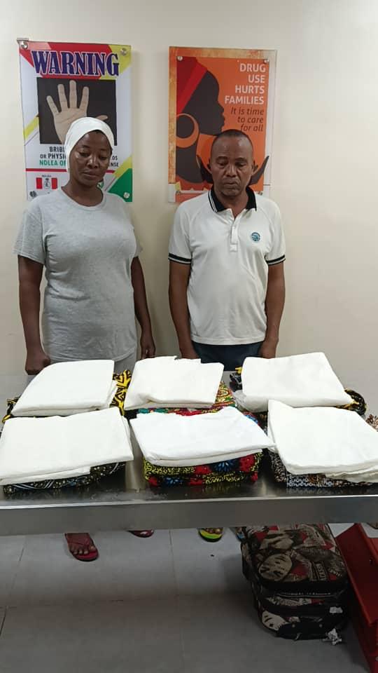 A widower, Ariyibi Ahmed Olaseinde and a divorcee, Akanbi Silifat Tunrayo who were going for lesser hajj in Saudi Arabia have been arrested by operatives of the National Drug Law Enforcement Agency, NDLEA, at the Murtala Muhammed International Airport, MMIA Ikeja Lagos for attempting to export 14.4 kilograms of cocaine concealed in lace and ankara fabrics.