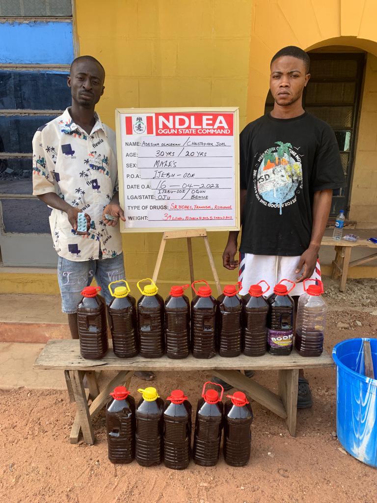 While two suspects: Adeshina Olalekan and Christopher Joel, were arrested at Lektop hotel, Igbeba, Ijebu Ode, Ogun State, with 39 litres of Skuchies, as well as various quantities of tramadol, and rophynol, operatives in Imo State intercepted a female suspect, Ijeoma Anyiam Loreza, 40, at Orogwe, Owerri North with 70 blocks of Cannabis Sativa weighing 30kg.
