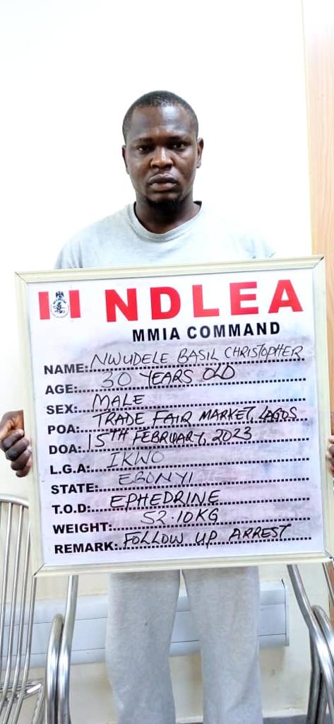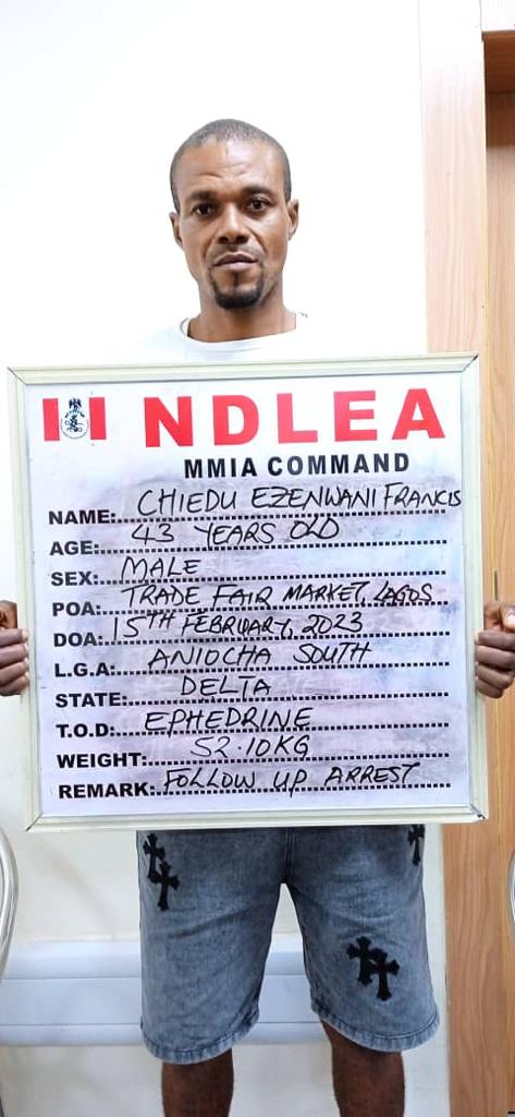 Spokesperson of the NDLEA, Femi Babafemi, in a statement said three traders at the Trade Fair Complex in Ojo area of Lagos: Nwudele Basil Christopher; Chiedu Ezenwani Francis and Donatus Nwojiji have been arrested in connection with attempts to export 52.10 kilograms of ephedrine, a precursor chemical and active ingredient for the production of methamphetamine, concealed in bunches of fishing threads and packed among other items in jumbo sacks that were intercepted at the SAHCO export shed of the Lagos airport on Sunday 31st January and Monday 1st February. It took the painstaking efforts of NDLEA officers and deployment of sniffer dogs to be able to discover the complex mode of concealment of the illicit substance.