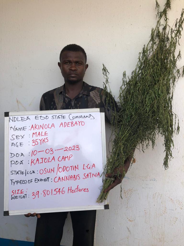 As part of ongoing operations to mop up illicit drugs across the country ahead of the next round of elections, NDLEA officers in the early hours of Friday 10th March, stormed Kajola forest in Kajola community, a border town between Edo and Ondo state where they destroyed three cannabis farms measuring 39.801546 hectares. The owner of the farms who claims to be the Ba’ale of Kajola, Akinola Adebayo, 35, was arrested on the farm at 2:30am, while two other suspects believed to be his workers: Arikuyeri Abdulrahman, 23 and Habibu Ologun, 25, were also nabbed in a hut near the farms.