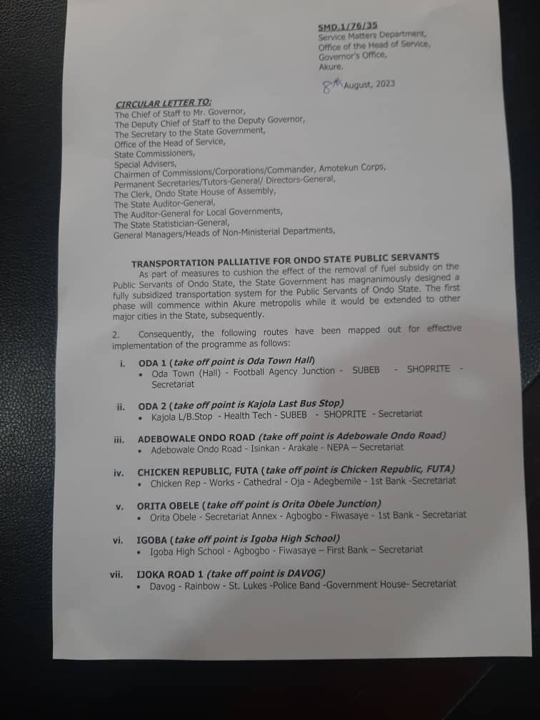 The Ondo State Government has announced the formalities for the implementation of transportation palliatives for public servants in the state.