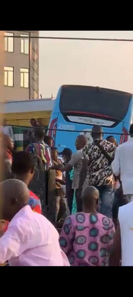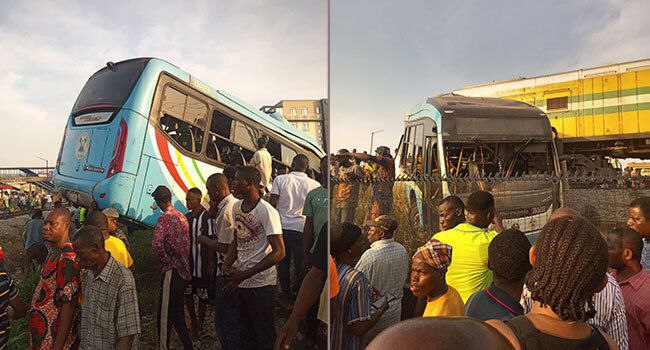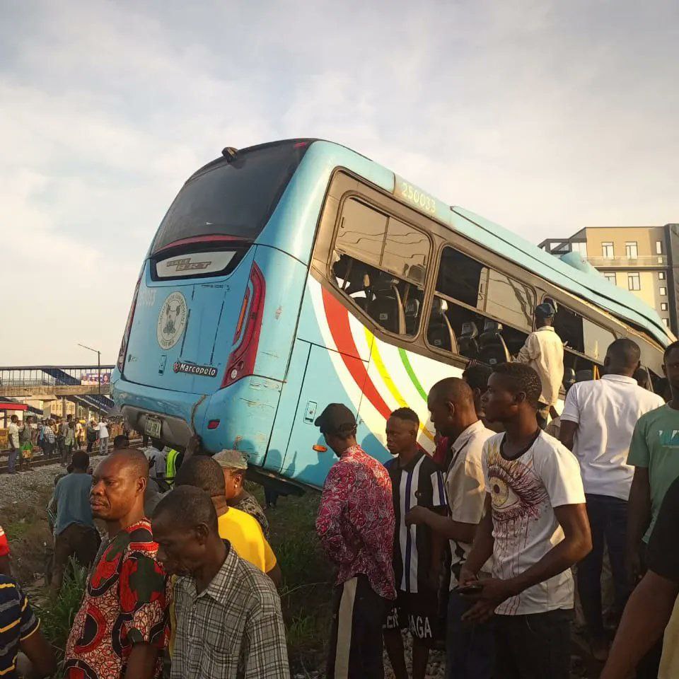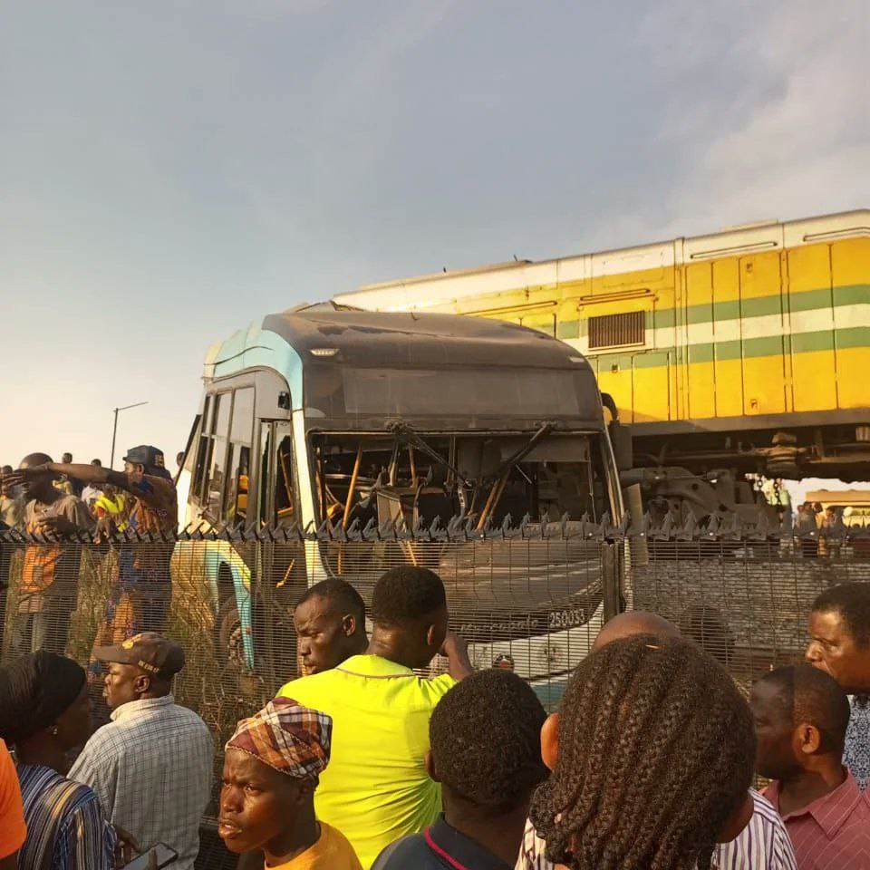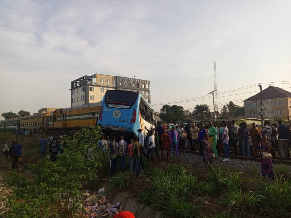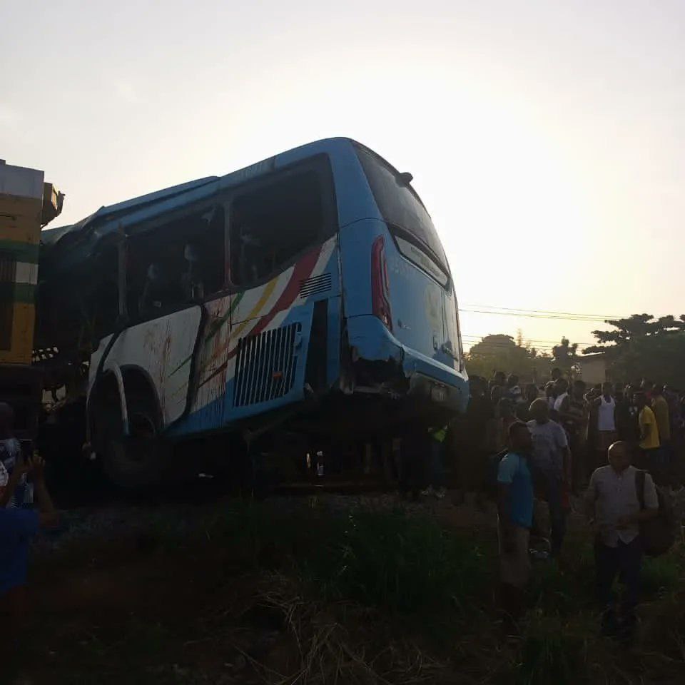 A Lagos State Government staff bus with registration no 04A- 48LA was on Thursday morning crushed by a moving train at PWD, Ikeja area of Lagos.