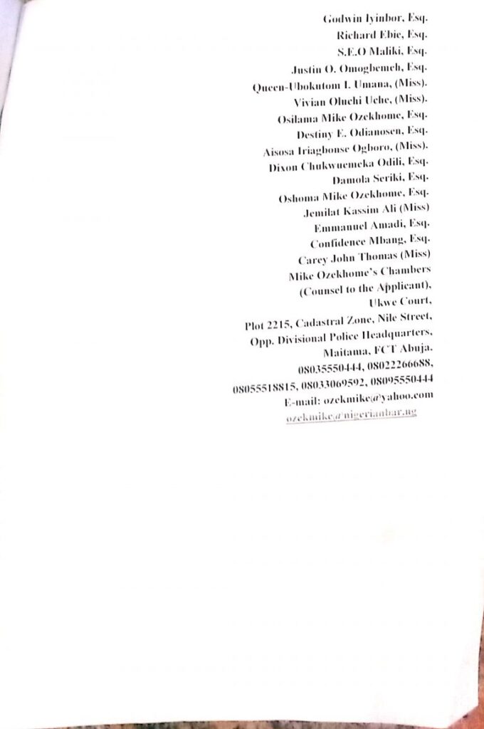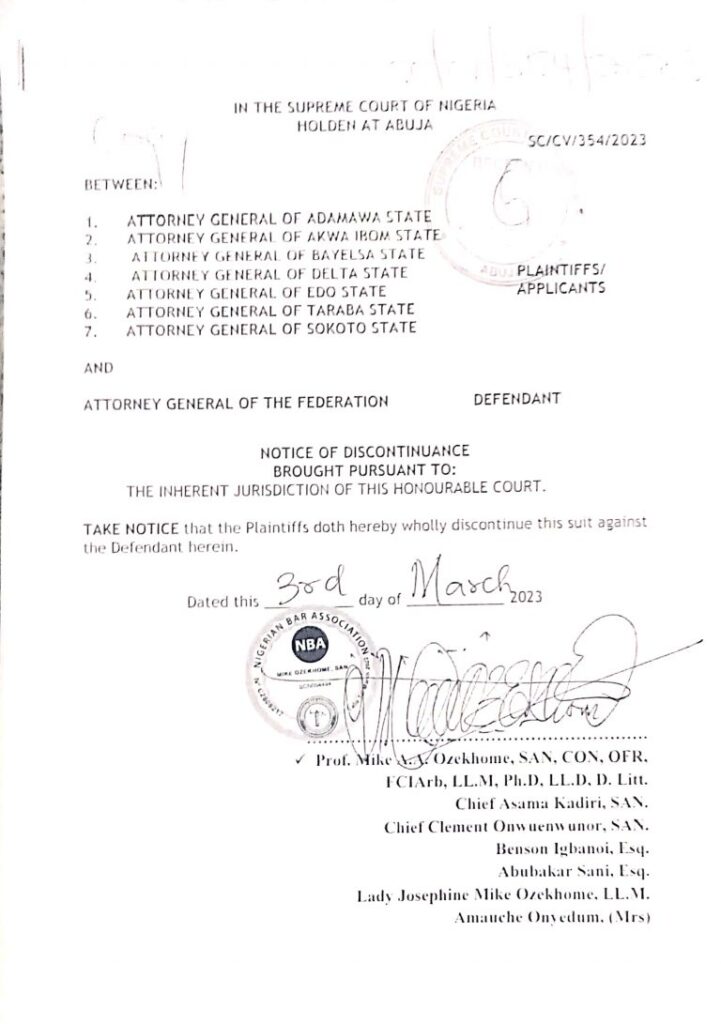 The Notice of Discontinuance which was signed by their lawyer and Senior Advocate of Nigeria, Mike Ozekhome, says “Take notice that the plaintiffs doth hereby wholly discontinue this suit against the defendant herein”.