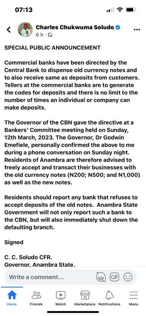 The Governor of the CBN gave the directive at a Bankers’ Committee meeting held on Sunday, 12th March, 2023. The Governor, Dr Godwin Emefiele, personally confirmed the above to me during a phone conversation on Sunday night. Residents of Anambra are therefore advised to freely accept and transact their businesses with the old currency notes (N200; N500; and N1,000) as well as the new notes.